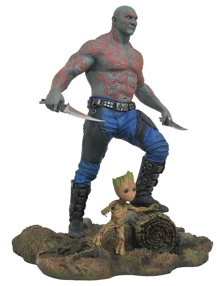Hochwertige und perfekt akzentuierte Diamond Select „Marvel Gallery“ Statue von Drax & Baby Groot aus dem Kinospektakel Guardians of the Galaxy Vol. 2.