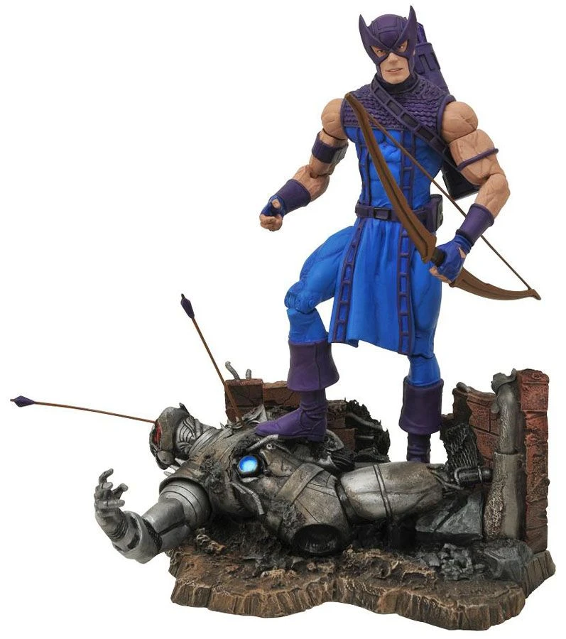 Marvel Select Actionfigur von Hawkeye auf einer aufwändig gestalteten Display-Base.