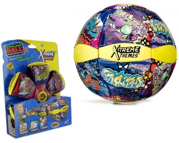 Phlat Ball XT X-Treme Graffiti mit Spielvorschlägen auf der Verpackungsinnenseite. We funktioniert’s? Ganz einfach: Zusammendrücken -> werfen ploppt willkürlich zum Ball. Hersteller: Tucker Toys.