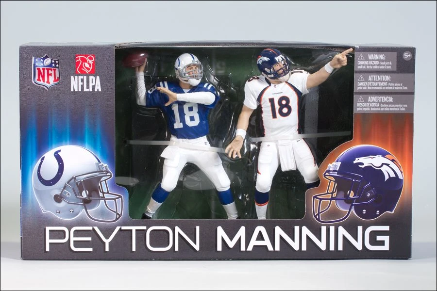McFarlanes 2-Pack mit den NFL-Figuren von Peyton Manning im blauen Indianapolis Colts Heim-Jersey und im neuen Denver Broncos Auswärts-Jersey.