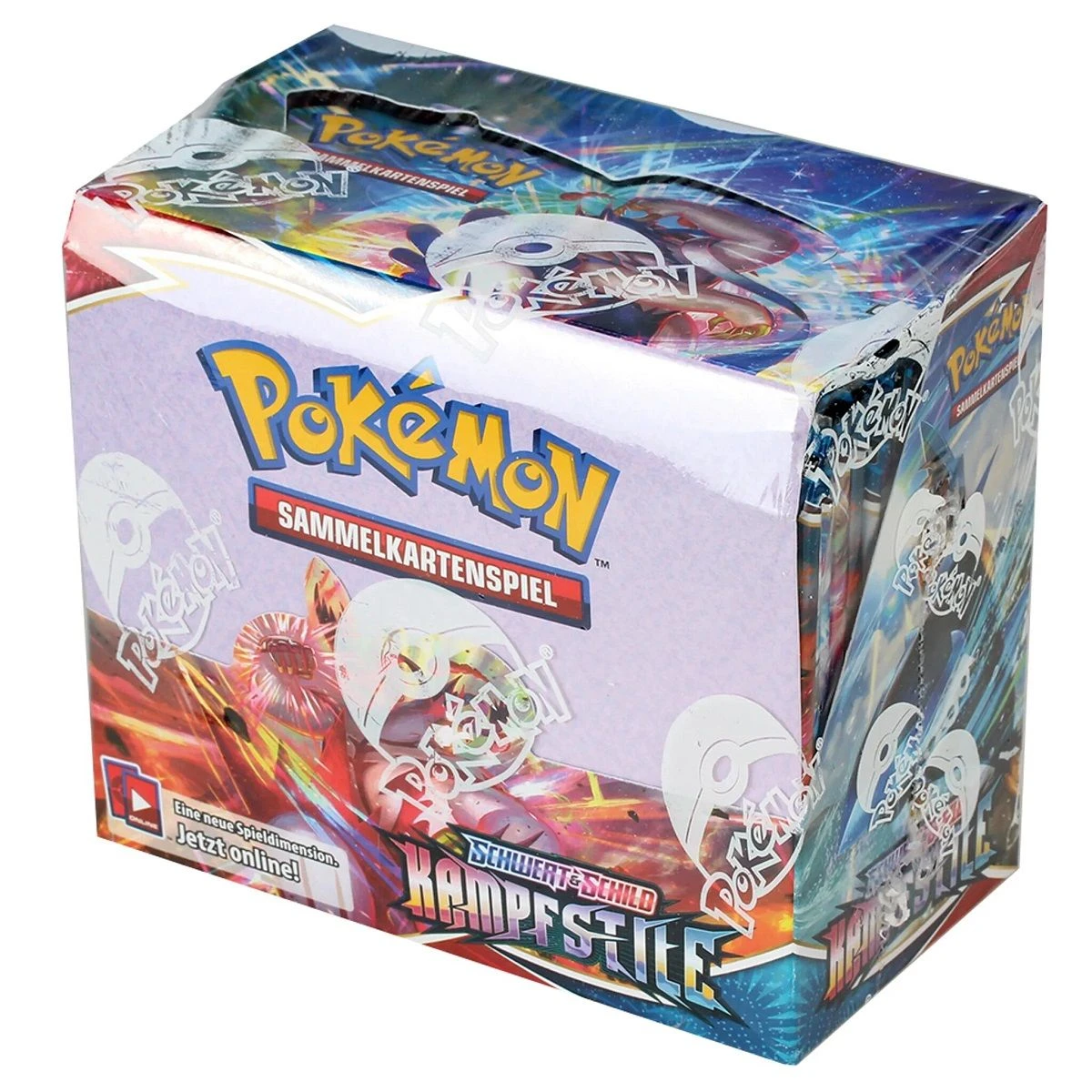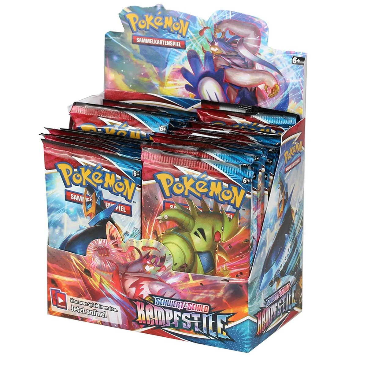 Pokémon Booster Display Box der Erweiterung Schwert und Schild in Deutsch. Wähle deinen Kampfstil mit Bedacht! Titanische Power oder unglaubliche Geschwindigkeit – alles hängt von deiner Kampfkunst ab! Mache dir die Macht von Pokémon-V wie Mimigma-V, Despotar-V, Impoleon-V und mehr zu eigen. Zusätzlich erwarten dich eine Handvoll eindrucksvoller Pokémon-VMAX, darunter Gigadynamax-Wulaosu-VMAX in beiden Kampfstilen, Fokussierter Angriff sowie Fließender Angriff! Liefere dir mit der Erweiterung Schwert & Schild – Kampfstile epische Gefechte!