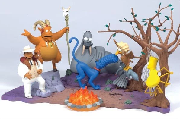 Dieses vollständige Boxed Set mit Simpsons Figuren zeigt einen Ausschnitt der Folge Treehouse of Horror XIII. mit Dr. Hibbert, dem Comic Book Guy, Homer, Marge, Bart, Lisa und Maggie. In dieser Parodie von Die Insel des Dr. Moreau (1896 erschienener und dreifach verfilmter Roman von H.G. Wells) wird die komplette Simpsons Familie in Tiere verwandelt.