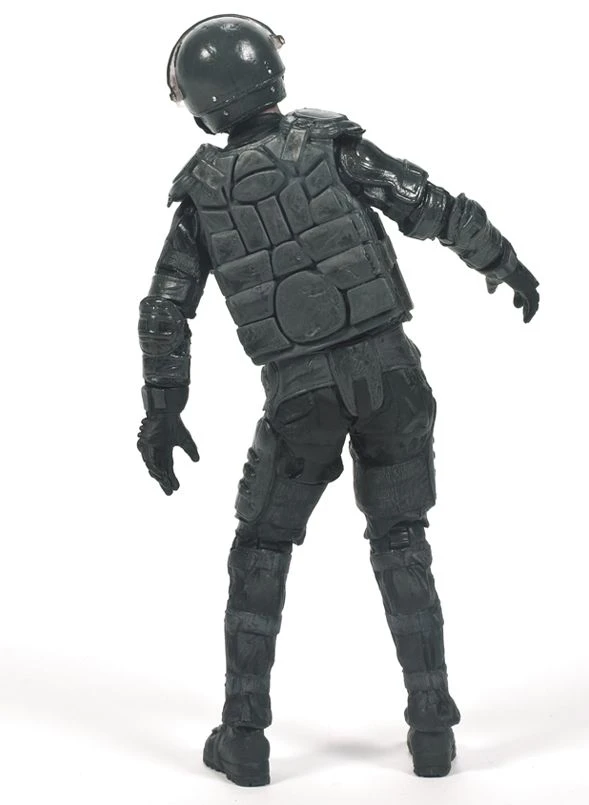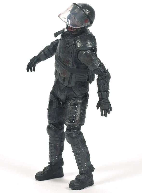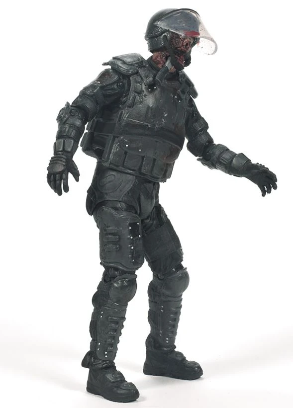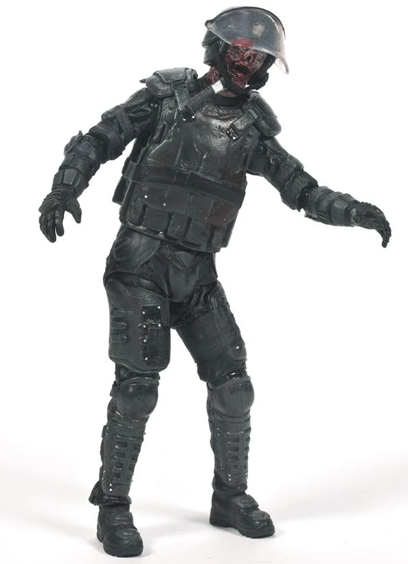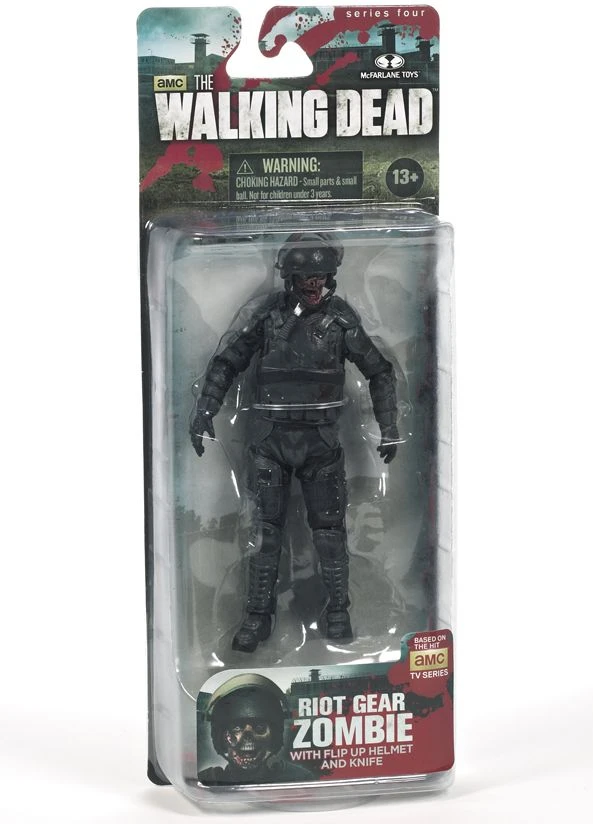 McFarlane Actionfigur Serie 4 eines Zombies mit taktischer Schutzausrüstung aus der erfolgreichen Horror-TV-Serie The Walking Dead. Die bewegliche Figur kommt mit aufklappbarem Helm und Messer im Unterkiefer.