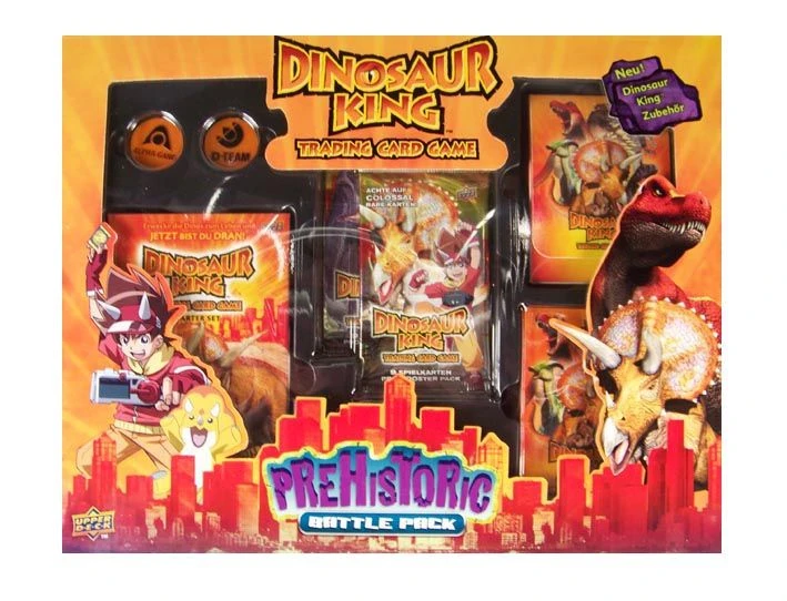 Das Dinosaur King Prehistoric Battle Pack enthält: 1 Deck mit 40 Karten, 2 Booster a 9 Sammelkarten, 1 Deckbox, 40 Dinosaur King Sleeves (Schutzhüllen), 2 Tokens und 1 Poster.