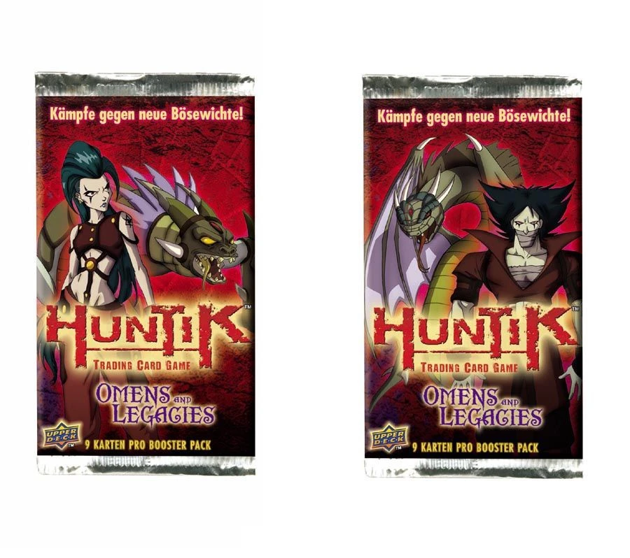 Auf dem Bild sind zwei unterschiedliche Boosterpacks zu sehen, der Artikel besteht aus einem zufälligen Huntik Omens & Legacies Booster.